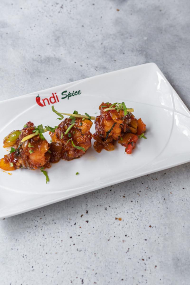 Tigerrekker stekt i søt chilli saus med ingefær og hvitløk. Tiger prawns cooked in sweet chilli sauce with ginger and garlic. Shellfish, Gluten and Soya