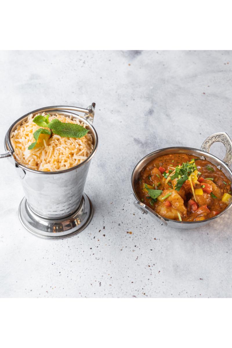 Tigerrekker kokt i paprika, løk, ingefær og fersket koriander saus. allergen Shellfish